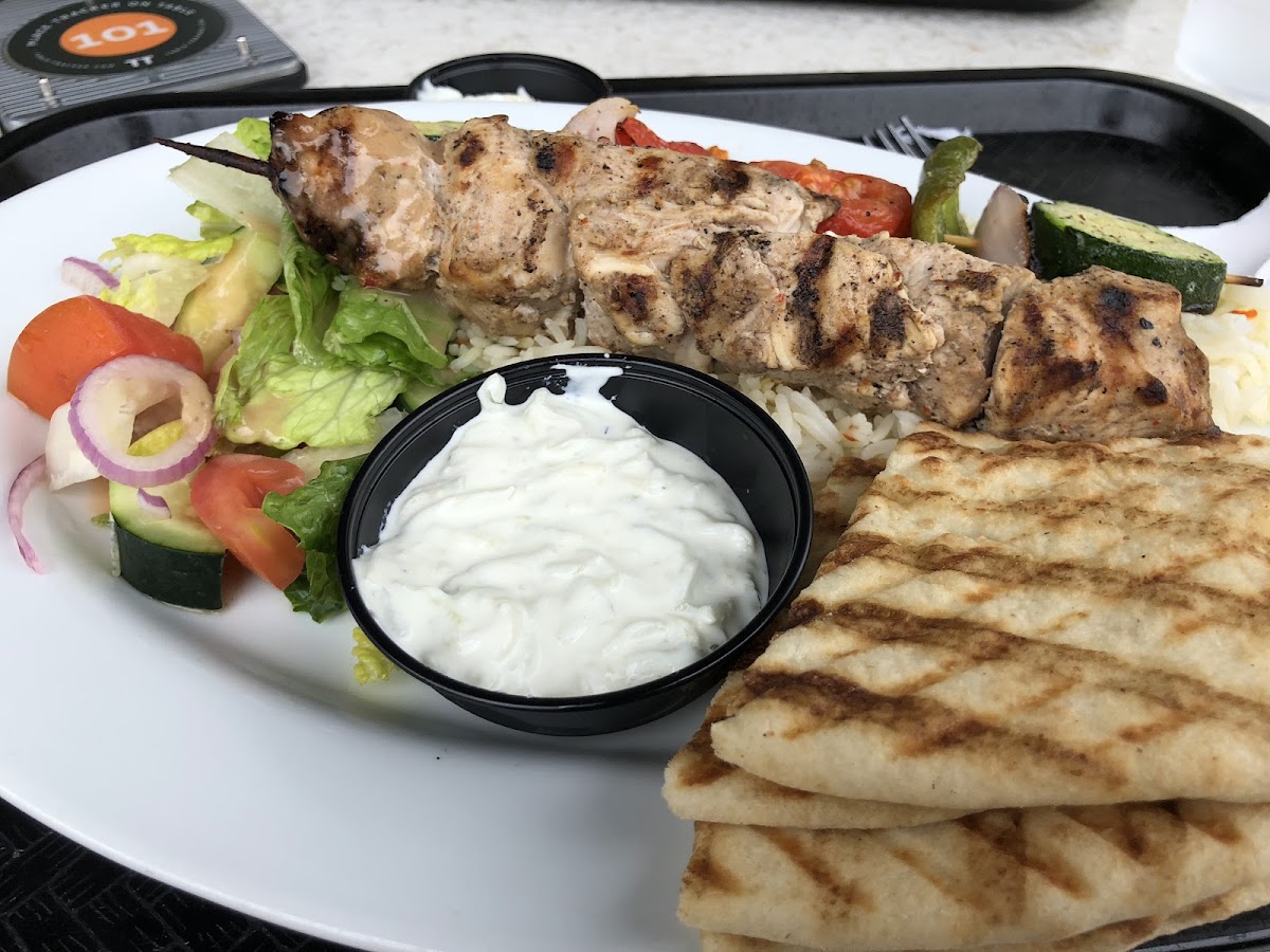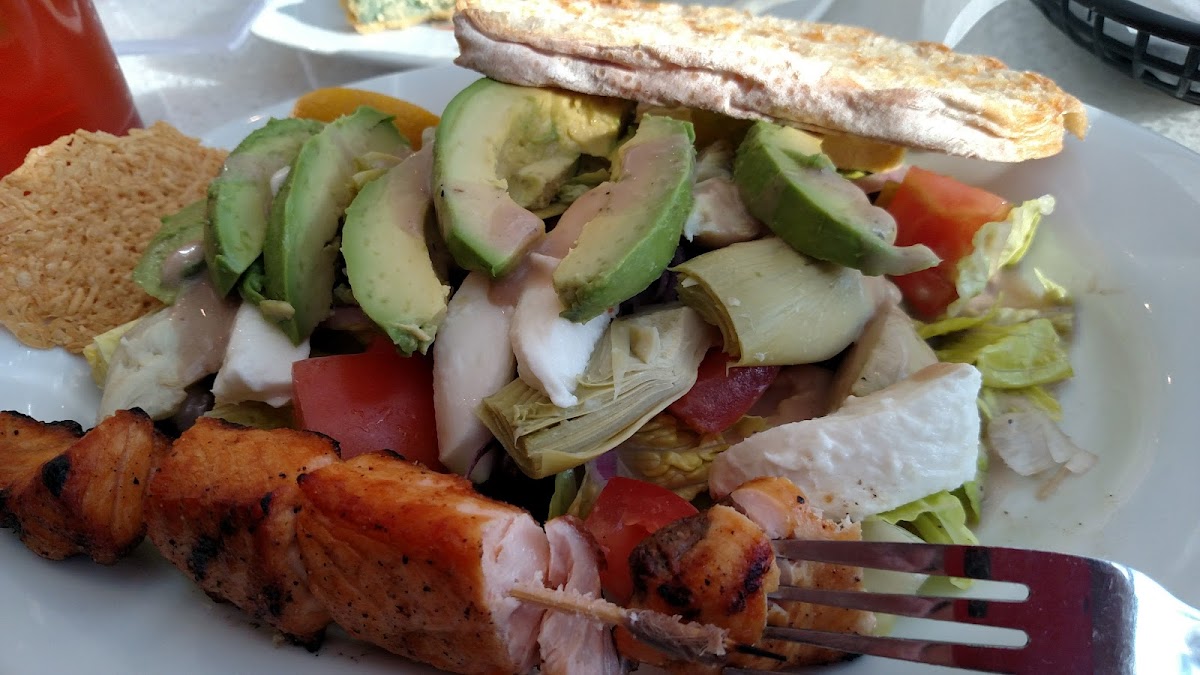 I indulged in a delightful Salmon Kabob, perfectly grilled to enhance its rich flavors. It was artfully arranged on a plate alongside fluffy basmati rice, which was fragrant and delicately seasoned. The dish also featured a colorful medley of grilled vegetables, their vibrant hues glistening with a charred finish, and a refreshing garden salad, crisp and light. Accompanying it all were warm, pillowy pita bread and a luscious tzatziki sauce, creamy and cool, adding a delightful tang to each bite.
