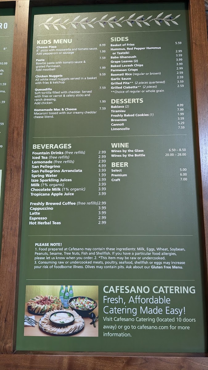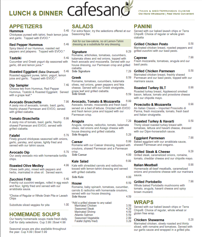 Cafesano offers a thoughtfully curated menu that blends Mediterranean and Italian influences, designed for casual dining and convenient takeout. The selection emphasizes fresh, quality ingredients in approachable dishes that can easily brighten a lunch break or satisfy an informal dinner.